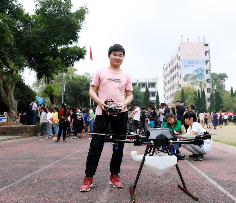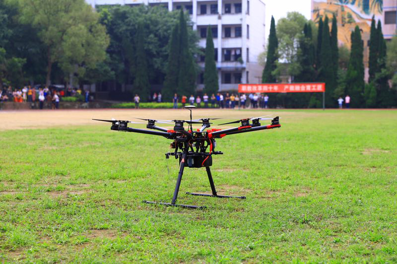 在動態部分,工作人員對組裝好的幾種無人機進行了仔細的檢測和調試,并對零創GY-1植保無人機模擬植保作業和特色以及行業無人機的機型和特點進行了詳細的介紹,在同學們的熱情期盼下,完成了最終的試飛。