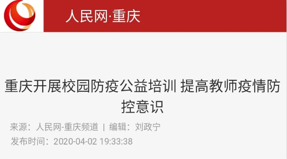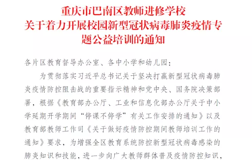 為進一步向廣大教師群體普及疫情防控知識,提高防范意識,掌握疫情防控技能,重慶市中小學教師發展中心攜手高教社教師發展中心,面向重慶市廣大中小學幼兒園教職工開展校園防控新型冠狀病毒肺炎疫情專題公益培訓。