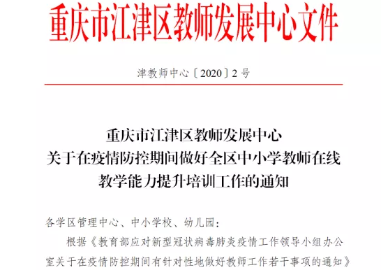 江津區教師發展中心下發《關于在疫情防控期間做好全區中小學教師在線教學能力提升培訓工作的通知(津教師中心〔2020〕2號)》,強調各單位要充分利用“國培計劃”學習平臺,積極引導、鼓勵教師充分利用網絡平臺免費開放共享的優質教師培訓課程,自主選學,開展線上自主研修。區內63所學校1069名教師參與到了此次培訓中。