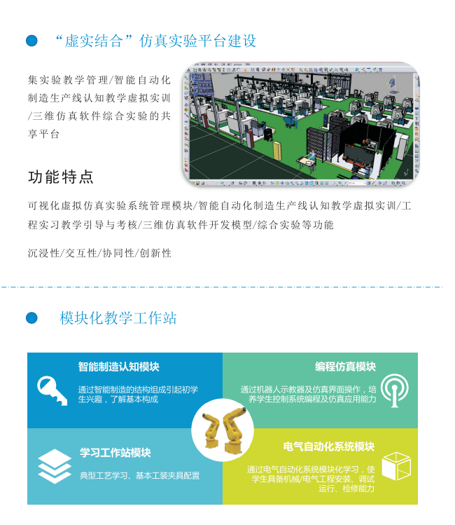 針對智能制造教育,為高等院校/中職院校全力打造智能制造創新教學體系建設(專業建設/師資培養/教學管理服務/資格證書認定/協同創新教學環境搭建);提供“1:1智能工廠”實驗室/“虛實結合”仿真實驗平臺/數字資源及現代應用技術實驗室建設,實現從虛擬到現實的智能制造實訓教學平臺。